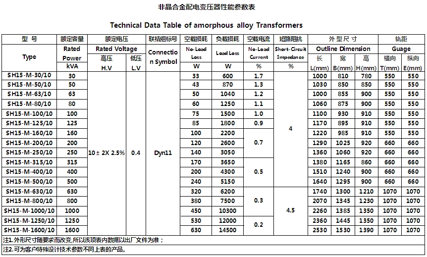 華盈公司SH15系列(10kV級) 三相油浸式非晶合金變壓器技術參數: